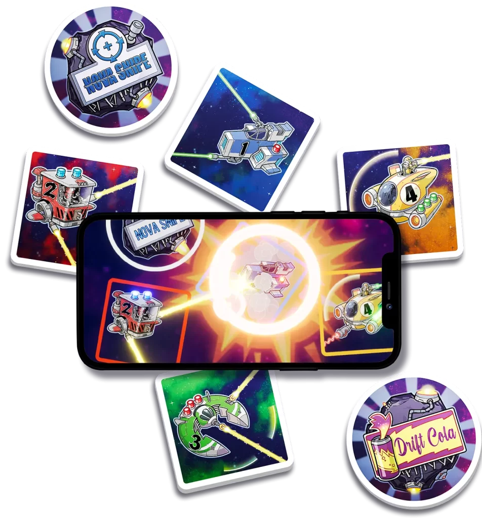 As the roar of the crowd resonates, the arena is lit with the brilliant glow of sponsor ads. Tactically place and orient your spaceships to score the most points by taking down enemy vehicles, collecting mineral units from asteroids, and impressing the game sponsors.