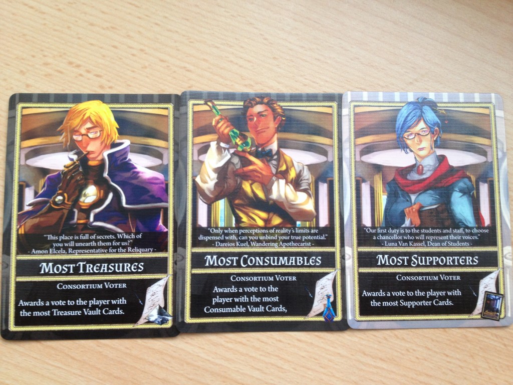 After the 5th round, reveal all the Consortium voters and determine who receives the vote for each one. Influence Points break ties with the player at the bottom of the stack counting as ‘ahead’, which is why it’s important to keep track of the stack. If nobody has anything for the voter, the voter abstains… The player with the most votes winning, Influence breaks this tie too.